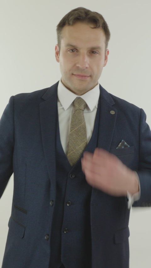 Costume trois pièces bleu et noir pour homme, coupe ajustée, élégant et formel, idéal pour un mariage ou une soirée.