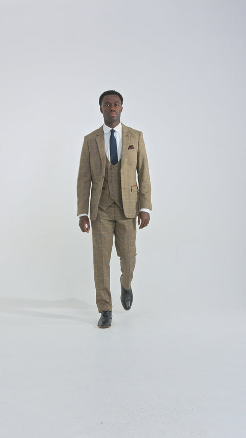 Costume trois pièces pour homme en tweed à chevrons beige et marron à carreaux, coupe ajustée, style classique double
